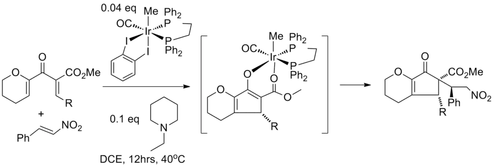 Zachycování enolátů elektrofily je méně časté. V jedné studii byla Nazarovova cyklizace spojena s Michaelovou reakcí, kdy iridiový katalyzátor iniciuje nukleofilní konjugovanou adici enolátu na β-nitrostyren. Při této tandemové reakci sloučenina irida katalyzovala obě přeměny: působila jako Lewisova kyselina při cyklizaci a v druhé části se nejprve navázala nitroskupina nitrostyrenu na iridium výměnou ligandů s kyslíkovým atomem karbonylesteru, po které proběhne samotná Michaelova reakce na opačné straně skupiny R.[19]
