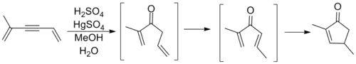 Přestože byly cyklizace podobné výše uvedeným známy již před vydáním Nazarovova článku, tak jeho výzkum přesmyků allylvinylketonů byl prvním významným příspěvkem v této oblasti. Nazarov zjistil, že allylové alkeny se izomerizují na divinylketony ještě před vznikem cyklopentenonu. V níže znázorněné reakci potřebný keton vzniká oxymerkurací alkynu.[10]
