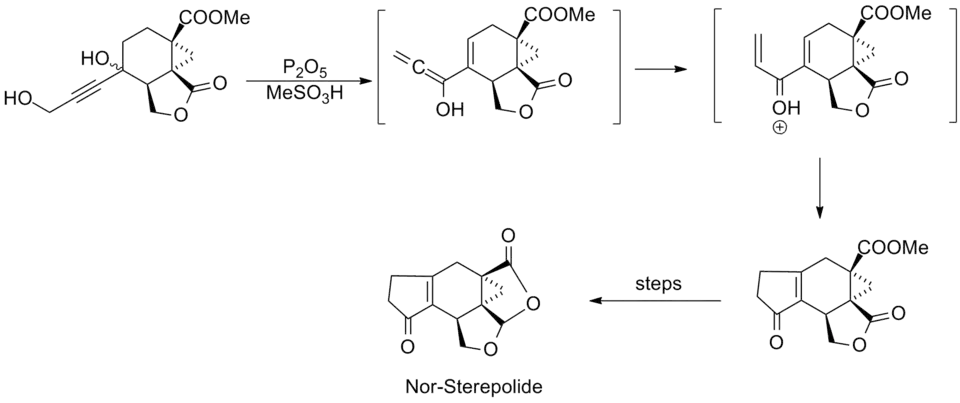 Další výzkum po několik let nebyl výrazný, až v 80. letech byly popsány syntézy využívající Nazarovovy cyklizace. Na následujících obrázcích jsou uvedeny kroky syntézy trichodienu a norsterepolidu, u druhé z těchto látek probíhá izomerizace alkynu na allen, kterou se tvoří divinylketon.[11][12]
