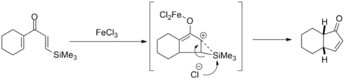 První pokusy o zlepšení selektivity Nazarovových cyklizací byly zaměřeny na využití beta-křemíkového efektu za účelem řízení regioselektivity eliminačního kroku. Tento postup zkoumal v 80. letech Scott Denmark z Univerzity Illinois v Urbana Champaign, který ke spouštění reakcí používal stechiometrická množství chloridu železitého. U bicyklických produktů, v různé míře, převažovaly cis-izomery.[13]