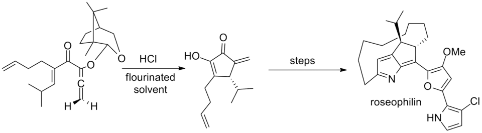 Byl také vyvinut chirální pomocník pro cyklizace nechirálních allenů, založený na kafru, použitý při první asymetrické syntéze roseofilinu. V jednom z kroků byla jako rozpouštědlo použita směs hexafluorpropan-2-olu a 2,2,2-trifluorethanolu.[2][20]