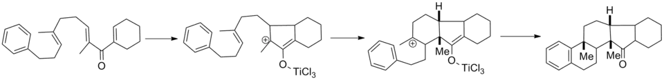 Při cyklizaci se vytváří oxyallylový kation; ten obvykle vzniká eliminací a následnou tautomerizací enolátu. Tyto dva kroky lze přerušit nukleofily (u eliminace) i elektrofily (u tautomerizace). Zachycování oxyallylových kationtů významně rozvinul Fredrick G. West.[17] Oxyallylové kationty lze zachytit pomocí heteroatomových i uhlíkatých nukleofilů i kationtových cykloadicí. Níže je zobrazena kaskádová reakce, při níž zachycení kationtu vede k tvorbě pentacyklického jádra a reakce je plně diastereoselektivní.[18]