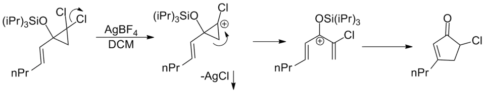 Nazarovových cyklizací se může zúčastnit každý pentadienylový kation a k jejich tvorbě lze použít mnoho různých přesmyků,[2] například kationtová otevírání kruhů allyldichlorcyklopropanů katalyzovaná stříbrem. Stříbrná sůl zajišťuje odstraňování chloridových iontů srážením chloridu stříbrného.[15]