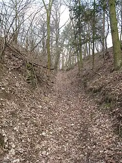 - Cesty, zanechávající pozůstatky především v prudších svazích, kde se vlivem eroze zařezávají do terénu ve formě úvozů.[15]