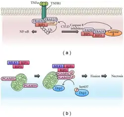 - ↑ a b c d e f g h i j CHOI, Mary E.; PRICE, David R.; RYTER, Stefan W. Necroptosis: a crucial pathogenic mediator of human disease. JCI Insight. 2019-08-08, roč. 4, čís. 15. Dostupné online [cit. 2019-09-21]. ISSN 2379-3708. doi:10.1172/jci.insight.128834. PMID 31391333. (anglicky)