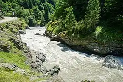 Stéká z jižního svahu hlavního kavkazského hřebene. Zdrojem jsou ledovce, spodní voda, sníh a déšť. Ústí do řeky Inguri jako její pravý přítok.