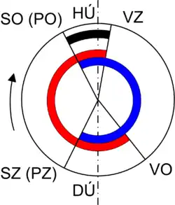 | symetrické | 55–70° před HÚ | 55–70° po HÚ | 30–50° před DÚ | 20–35° před DÚ | 20–35° po DÚ | 30–50° po DÚ |