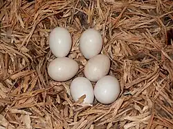 Kopulace probíhá na stromě na silné větvi do cca 100 m od hnízda. Samec nejdříve pomalu nakráčí na záda samice, která dá najevo souhlas s pářením natažením zad do vodorovné pozice, pokrčením hlavy a jemným napnutím křídel. Samec zezadu nejdříve hladí samici zobákem a za pomoci roztažených křídel udržuje balanc, načež dojde ke spojení. Během kopulace samice někdy vydává vysoce položené jemné zapísknutí. Samice se občas otočí na bok a samec se dotkne svým zobákem samičina zobáku. Po kopulaci, která trvá kolem 15 minut, se samec vyčerpaně sesune na větev vedle samice a po chvíli odlétá pryč. Samice klade 3–5 vajec (výjimečně 1 nebo až 8). Interval mezi kladením vajec je 3–4 dny. Vejce jsou bílá a lehce oválná o rozměrech 42×31 mm.[23] Inkubuje pouze samice, která většinu inkubace prospí. Její krmení zajišťuje samec, který pravidelně přilétává k hnízdu a hlasem vyláká samici, kterou nakrmí regurgitací potravy. Doba inkubace trvá 23–25 dní. Mláďata se rodí postupně během několika dní, takže hlavně čerstvě po vyklubání se jejich velikost výrazně liší.[33]