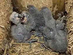 Mláďata se rodí obalena bílým prachovým peřím a se zavřenýma očima. V době nepřítomnosti samice jsou těsně vedle sebe. Samice je stále většinu času přítomna na hnízdě. Mezi 11.–20. dnem se mláďata opeří do šedého šatu, jejich oči se napůl otevřou a dokáží se i posadit a nemotorně pohybovat po hnízdě. Následující týdny se mláďata začínají pomalu opeřovat a samice začne trávit čím dál tím méně času na hnízdě, do kterého se vrací hlavně za účelem nakrmení ptáčat. Mezi cca 60.–70. dnem mláďata opouštějí hnízdo. Řada ptáčat přitom po opuštění hnízda skončí nejdříve na zemi, kde zůstávají i několik dní, než posbírají dostatek sil k prvnímu letu nebo vydrápání se zpět do stromoví.[33]