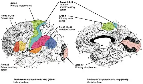 Na počátku 20. století Korbinian Brodmann zmapoval a rozčlenil mozkovou kůru do 52 podoblastí na základě jejich cytoarchitektonické struktury (struktury buněk) a funkcí. Tyto oblasti se dnes nazývají Brodmannovy oblasti a Brodmannovo dělení dodnes slouží jako nejčastěji používaná cytoarchitektonická mapa mozkové kůry.[4]
