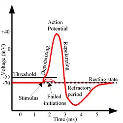 Membrána, na které převažují elektricky řízené iontové kanály, reaguje na podráždění podle zákona „vše nebo nic“. Buď reaguje vzruchem, nebo ne, a pokud ano, tak s nejvyšší možnou intenzitou. Ke vzniku vzruchu musí dojít k místní depolarizaci membrány, a náhlému rychlému poklesu membránového potenciálu. Prahová hodnota, při které dojde k otevření elektricky řízených iontových kanálů a ke vzniku vzruchu je –55 mV. Odstup od šumu neuronu je 3 až 30 dB.[4]
