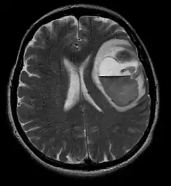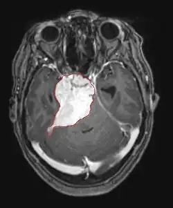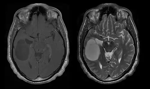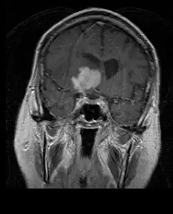 Na -MRI ukazuje intrakraniální tumor jako masivní lézi, která se po použití kontrastní látky může stát více luminiscenční. Vždy však dojde k anomálii signálu -Magnetická rezonance, která indikuje přítomnost neoplazie nebo vazogenního edému. Obvykle zvýšená luminiscence (zesílení kontrastu) svědčí pro nádor vyššího stupně malignity. Pro glioblastom je charakteristický kontrastní prstenec, jehož luminiscenční část odpovídá vitální části maligního nádoru a tmavší -hypointense oblast odpovídající nekróze tkáně.