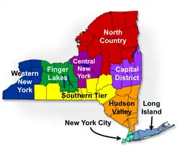 Stát New York má 62 okresů (county), které se dále dělí na 932 okrsků (town), 62 měst (city) a 14 Indiánských rezervací.