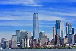One World Trade Center na jižním Manhattanu (uprostřed). Po teroristických útocích z 11. září 2001 nová dominanta New Yorku