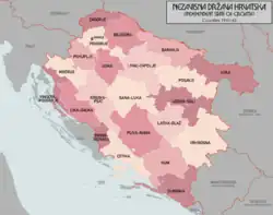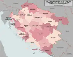 Nezávislý stát Chorvatsko měl čtyři úrovně správních rozdělení: Velké opčiny (velike župe), okresy (kotari), města (gradovi) a opčiny (opcine). V době svého založení měl stát 22 velkých opčin, 142 okresů, 31 měst[33] a 1006 obcí.[34]
