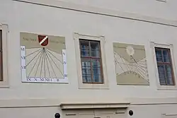 Na nádvoří se nachází dvoje sluneční hodiny. Hodiny vlevo ukazují pravý místní čas a zdobí je latinský nápis Sine sole nequid sum, v českém překladu Bez slunce nejsem ničím. Hodiny vpravo ukazují tzv. staročeský čas, tedy dobu, která uplynula od západu slunce předchozího dne. Na hodinách je latinský nápis Sol cognovit occasum suum, to znamená Slunce si odpočítalo svůj západ. V dlažbě je vyznačen poledník, na který upozorňuje jednoduchá tabulka s nápisem Po této přímce prochází 14. poledník V.Z.D. Na východní straně zámku se nachází kostel Povýšení svatého Kříže, který roku 1724 barokně přestavěl František Maxmilián Kaňka. Stojí na okraji skály nad raně gotickou kaplí ze třináctého století. Zámecká kaple byla původně zasvěcena svaté Kateřině.