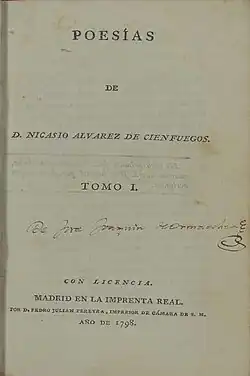Dílo Nicasio Álvarez de Cienfuegos ve Wikizdrojích (španělsky)- (španělsky) Nicasio Álvarez de Cienfuegos - Poesías - Biblioteca Virtual Miguel de Cervantes