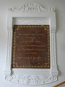 Na budově je umístěna červená mramorová deska s nápisem „Nemocnice tato založena k blahu veřejnému LÉTA PÁNĚ 1902 na oslavu padesátiletého panování Jeho Apoštolského Veličenstva císaře a krále Františka Josefa I.“