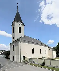 Jednoduchý farní halový kostel byl postaven roku 1814, na místě dřívějšího vyhořelého gotického kostela z roku 1809 zasvěceného Panně Marii. V roce 2009 byl kostel opravován.