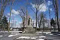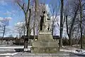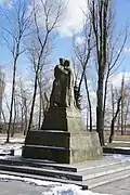 Památník líčí muže, který objímá ženu a dítě. Na podstavci je nápis: NIGDY WOJNY (česky: NIKDY VÁLKU).