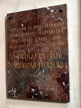 V lodi kostela sv. Mikuláše na Staroměstském náměstí v Praze je textová pamětní deska se zněním: „MUČEDNÍK ZA PRAVOSLAVNOU / VÍRU A VĚRNOST SLOVANSTVU / PROTOJEREJ A 1901–1914 / PŘEDSTAVENÝ TOHOTO CHRÁMU / O. NIKOLAJ RYŽKOV / 26. IX. 1868 – 6. II. 1920.“[2]