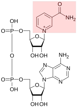 NAD+ (oxidovaná forma NADH), obsahuje nikotinamidovou složku (zvýrazněna červeně)