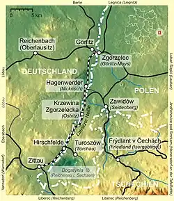 Za zastávkou Görlitz-Weinhübel trať opouští území města. Následující zastávka Deutsch-Ossig byla zrušena, stejnojmenná obec zanikla kvůli povrchové těžbě hnědého uhlí. Na nádraží Hagenwerder dříve odbočovala hlavní trať doprava ve směru na Seidenberg (Zawidów), a pokračovala dále přes Frýdlant v Čechách do Liberce. Po posunutí hranic Polska k Lužické Nise byl provoz zastaven, trať byla později snesena. Krátce za nádražím Hagenwerder trať poprvé překonává tok Lužické Nisy a dále vede po území Polska. Zleva se připojuje trať ze Zawidówa, která je dnes využívána pouze pro nákladní přepravu. Následující nádraží Krzewina Zgorzelecka, dříve Ostritz, je jediným místem kde staví německé vlaky na polském území. Na zastávce Bratków Zgorzelecki (Marienthal) již vlaky nestaví.