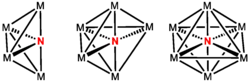 Jelikož nitridoligandy mohou tvořit můstky, tak je i popsáno několik shluků s nitridovými ligandy v centrech. Takovéto nitridoligandy se označují jako intersticiální. Někdy je nitrid plně uzavřen mezi šesti nebo více atomy kovu a nemůže se účastnit reakcí, i když se podílí na vazbách mezi kovy.[9]