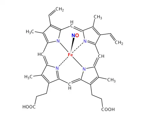 • U nasoleného masa: Maso zpracované nasolováním obsahuje dusitan a má pH přibližně 5, kde téměř všechny dusitany jsou přítomny jako NO2 (99%). Do nasoleného masa se přidá také askorbát sodný (nebo erythorbát nebo vitamin   C). Askorbát inhibuje nitrosaci aminů na nitrozamin, protože askorbát reaguje s NO2, aby se vytvořil NO. [7] [8] Ascorbát a pH   5 proto upřednostňuje nitrosylaci hemového železa, tvořící nitrosylhem, červený pigment, pokud je obsažen uvnitř myoglobinu, a růžový pigment, pokud byl uvolněn vařením. Podílí se na "slaninové příchuti" nasoleného masa: nitrosylhem se proto považuje za přínos pro masný průmysl a pro spotřebitele. [9]