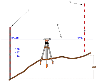 Při nivelaci kupředu se nivelační přístroj postaví na bod o známé výšce a na cílový bod se svisle postaví měřická lať. Dalekohledem se odečte výšková hodnota na lati a rozdíl výšky nivelačního dalekohledu od země a této hodnoty udává převýšení cílového bodu. Při měření delších tratí se postup opakuje. Při nivelaci ze středu se jedna lať postaví na výchozí bod a druhá na dohled ve směru trasy. Přístrojem, který stojí zhruba uprostřed nich, se pak odečtou hodnoty na obou latích a jejich rozdíl udává převýšení v daném úseku (viz obr.)[1] Předností nivelace ze středu je, že se některé chyby měření kompenzují.