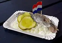 - Hollandse Nieuwe, matesy s jemně krájenou cibulkou a kořeněnou okurkou.