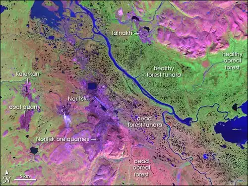 - ↑ coal quarry = uhelný důl, Noril'sk ore quarries = norilské rudné doly, healthy/dead forest-tundra = zdravá/odumřelá tundra, healthy/dead boreal forest = zdravý/mrtvý severský jehličnatý les (tajga)