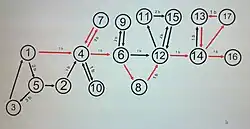 Červeně je názorně vyznačena cesta, kterou se vydal jeden ze studentů. Ze schématu je patrné, že si nevěděl rady s otázkou č. 4 a znovu pak s otázkami 6 a 14. Zpravidla se při tomto testu sbírají body a úkolem je sebrat co nejméně bodů, tzn. projít co nejmenším počtem otázek.