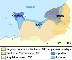 Ve starověku se zde nacházelo keltské osídlení, které bylo v letech 58–52 př. n. l. násilně přičleněno k Římské říši. Z tohoto římského období pochází většina dnešních jmen měst a oblastí – Lillebonne, Coutances, Pays de Caux. Po příjezdu Normanů začalo období strachu a strádání. Normané rabovali, ničili a znásilňovali. Častým cílem násilností byly zvláště kláštery se svým nahromaděným bohatstvím. Po čase se začali vikinští válečníci pomalu usazovat, uzavírat s domorodci mír a budovat trvalá panství. Roku 911 západofranský král Karel III. Francouzský porazil normanského vůdce Rolla a důsledkem normanské porážky byla smlouva mezi oběma vládci. Rollo se nechal díky intervenci biskupa z Rouenu pokřtít a uznal Karla III. za svého lenního pána. Na oplátku jím byl jmenován hrabětem rouenským.
