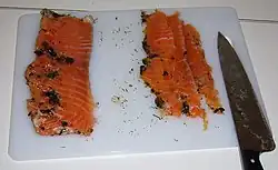 Gravlax, marinovaný losos v soli, cukru, kopru a brandy. Podává se se smetanovou nebo hořčičnou omáčkou. Často na toastech.