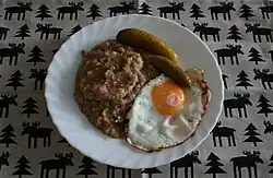 Pyttipanne, malé kousky v pánvi, směs brambor, mletého masa nebo klobásy se smaží na pánvi s nakládanými okurkami, řepou, kapary a vejcem.