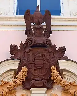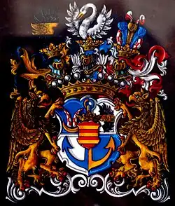Rodový erb byl po povýšení do panského stavu rozčtvrcen, znázorňuje v modrém poli dva stříbrně a červeně šachované volské rohy, dále pak černé křídlo se zlatým břevnem a zlatomodrou kotvu. Na přilbě se stříbrno-červeným pláštěm spočívají tytéž rohy. Později do znaku přibyl erb hrabat z Rienecku.