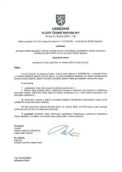 - ↑ a b Usnesení vlády České republiky č. 69/2020 Sb., o vyhlášení nouzového stavu pro území České republiky z důvodu ohrožení zdraví v souvislosti s prokázáním výskytu koronaviru /označovaný jako SARS CoV-2/ na území České republiky na dobu od 14.00 hodin dne 12. března 2020 na dobu 30 dnů. In: Sbírka zákonů. 2020. Dostupné online. Ve znění pozdějších předpisů. Dostupné online.