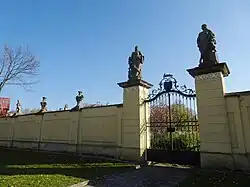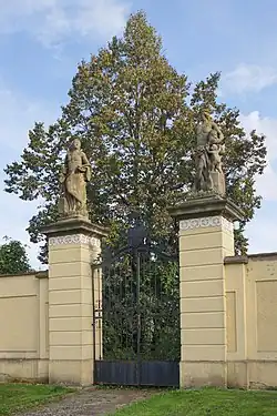 Na jižní a západní straně park lemuje zeď s barokními plastikami. Její jižní strana před hlavním průčelím zámku má sochařskou výzdobu, na sloupcích stojí střídavě rokokové sošky puttů a dekorativní kamenné vázy a na pilířích po stranách vstupních mřížových vrat se znakem Vetterů z Lilie stojí dvě ženské alegorické postavy. Podobná brána a pilíře s kamennými vázami prolamuje západní zeď a slouží dnes jako hlavní přístup k zámku.[37]