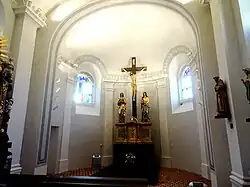 Uvnitř má kaple proti oltáři panskou oratoř a hudební kruchtu s harmoniem. Kruchta byla vytvořena v 19. století, je nesena litinovými sloupky a má dřevěnou vyřezávanou poprseň. Pilastry po stranách lodi původně opticky nesly bohatou barokní freskovou výzdobu klenby, která však byla v roce 1970 zalíčena. Mobiliář kaple tvoří nevelký vyřezávaný oltář se sochou Ukřižovaného, několik soch a obrazy křížové cesty.[19][33]