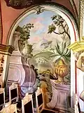 V přízemí zůstala zachována barokní dispozice, místnosti jsou zaklenuty většinou valenou klenbou, ve větších místnostech s lunetami. Vstupní hala má pruskou klenbu (zámek nemá centrální schodiště) a na něj navazuje sala terrena s bohatou freskovou výzdobou z doby kolem roku 1760. Místnosti v patře jsou až na některé chodby plochostropé, stropy jsou zdobeny fabiony a někdy i štukovými a dřevěnými zrcadly.[30][32]