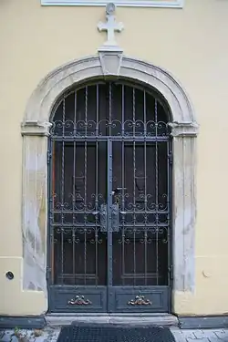 Před touto branou se nachází rovněž plastika sv. Jana Nepomuckého, rovněž z 2. poloviny 18. století. Ta byla roku 2009 plně restaurována, přičemž byl obnoven i zcela zvětralý alianční erb Karla Josefa Vettera von der Lilie a Marie Ludowiky Orlíkové z Laziska.[37][38]