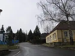 Pohled ke vjezdu na budovou dozorčího vchodu a ubytovny -