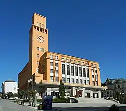 Jedná se o pětipatrovou obdélníkovou budovu.[1] Funkcionalistické řešení je ovlivněno tradičními prvky, které architekt Karel Winter poznal na své studijní cestě po Itálii, kde sledoval koncepci gotických a renesančních radnic.[3] Výrazným prvkem budovy je 51 metrů vysoká hranolová věž umístěná na jihozápadním nároží. Přízemí je obloženo žulovým obkladem, výrazná římsa ho pak odděluje od pater opatřených jemně zrnitou omítkou v okrové barvě. Další nápadná římsa odděluje 4. a 5. nadzemní podlaží. Hlavní jižní vstup je zvýrazněný kamenným portálem. Průčelí nad spodní římsou je pak vertikálně členěno vysokými okny.[5]
