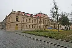Budova byla postavena v letech 1883–1884 podle projektu architekta Arnošta Jenšovského.[2][3] Budova je dvojpodlažní. Hlavní průčelí má 19 okenních os, je přísně symetricky členěné do středového trojosého rizalitu a menších jednoosých nárožních rizalitů. Západní (pravé) křídlo má čtyři okenní osy, zatímco levé křídlo má sedm okenních os.