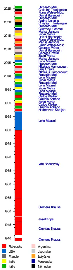 Od roku 1980 se dirigenti novoročního koncertu každoročně střídají. Staly se jimi takové osobnosti hudební scény, jako jsou Herbert von Karajan, Claudio Abbado, Nikolaus Harnoncourt nebo Georges Prêtre, který koncert v roce 2010 dirigoval ve svých pětaosmdesáti letech.[5][6] Světoznámý indický dirigent Zubin Mehta řídil tyto koncerty již pětkrát, a to v letech 1990, 1995, 1998, 2007 a 2015.[7]