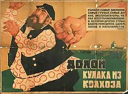 Rozkulačení (rusky: раскулачивание) byla sovětská kampaň politických represí, včetně zatčení, deportací a poprav miliónů kulaků (bohatých rolníků) a jejich rodin v období 1929–1932. Stalin vyhlásil "likvidaci kulaků jakožto třídy" v roce 1929.[4] Plán schválilo politbyro roku 1930 a rozpracoval ho čekista Jefim Jevdokimov. Aby se usnadnilo vyvlastnění zemědělské půdy pro projekt kolchozů a sovchozů, souběžná propagandistická kampaň vykreslila kulaky jako třídní nepřátele a reakcionáře. Bylo deportováno více než 1,8 milionu rolníků. Hlad, nemoci a popravy během rozkulačování vedly k 530 000 až 600 000 úmrtím, ačkoli existují i vyšší odhady. Ostatní byli deportování na Sibiř, na Ural nebo do Kazachstánu. Tato politika postavila veškeré zemědělství v Sovětském svazu pod státní kontrolu. Jedním z mála sovětských komunistů, kteří rozkulačení kritizovali, byl předseda rady lidových komisařů Alexej Rykov, který ho označil za metodu "válečného komunismu" a za nezodpovědnost v době, kdy je produktivita sovětského zemědělství stále ještě poloviční oproti západní Evropě.[5] Rykov se později stal obětí Stalinovy Velké čistky.[6]