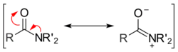 Amidy karboxylových kyselin mají dvě hlavní rezonanční struktury. Energetická bariéra rotace kolem amidové vazby bývá 75–85 kJ/mol, což je mnohem více než u běžných jednoduchých vazeb; například u vazby C-C v molekule ethanu je to kolem 12 kJ/mol.[2] Poté, co nukleofil atakuje substrát a vznikne tetraedrický meziprodukt, tak energetická výhodnost rezonančních struktur zmizí; tímto lze vysvětlit velmi nízkou reaktivitu amidů.[3]