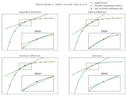 Geometricky derivace vyjadřuje směrnici tečny ke grafu funkce v bodě. Při numerické derivaci je tečna nahrazena sečnou vedenou známými body na grafu funkce.