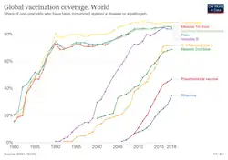 Celosvětová proočkovanost v letech 1980 až 2019 u jednoletých dětí[1]